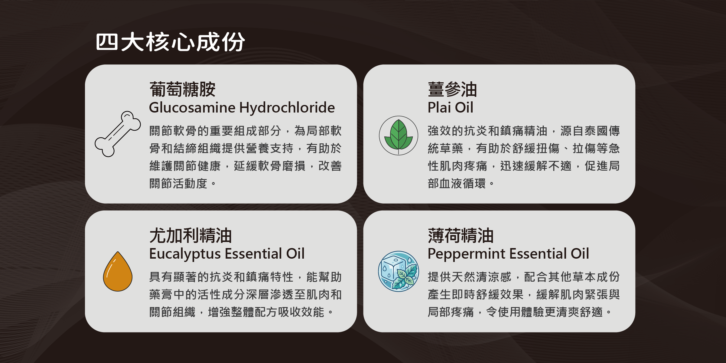 四種天然草本精華協同作用,抗炎、鎮痛、修復三效合一。